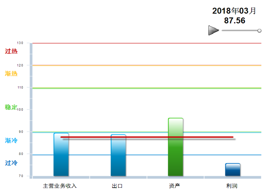 从分项指数看,四项分项指数均较上月有所下降,其中出口及利润景气指数下降幅度较大:主营业务收入景气指数89.52,位于“渐冷”区间,较上月下降0.91点;出口景气指数为88.82,位于“渐冷”区间,较上月大幅下降10.87点;资产景气指数为96.27,位于“稳定”区间,较上月下降1.18点;利润景气指数75.81,位于“过冷”区间,较上月下降6.45点。