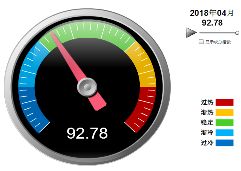 据中国轻工业经济运行及预测预警系统数据显示,2018年4月中国乳品制造行业景气指数为92.78,处在绿色“稳定”区间,较3月下降3.73点。