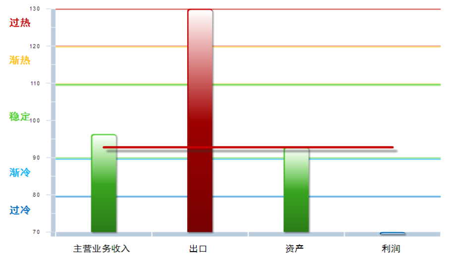 从分项指数看,出口景气度有较明显回升,其他三项分项指数均环比上月下降,其中:主营业务收入景气指数96.34,位于“稳定”区间,较上月微升0.01点;出口景气指数为144.13,位于“过热”区间,较上月大幅上升34点;资产景气指数为92.80,位于“稳定”区间,较上月下降1.71点;利润景气指数67.69,位于“过冷”区间,较上月大幅下降26.52点。