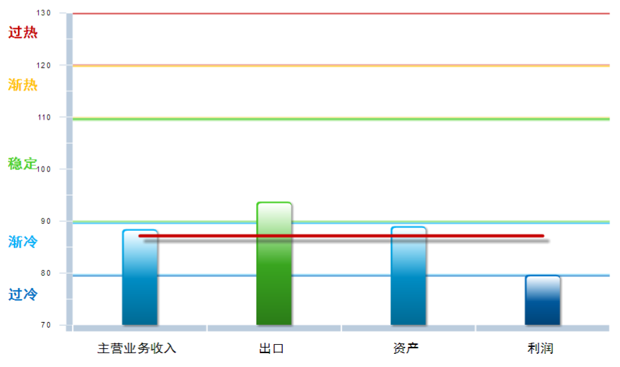 从分项指数看,出口景气度有较明显回升,其他三项分项指数均环比上月下降,其中:主营业务收入景气指数88.47,位于“渐冷”区间,较上月下降0.92点;出口景气指数为93.74,位于“稳定”区间,较上月上升1.33点;资产景气指数为89.03,位于“渐冷”区间,较上月上升0.38点;利润景气指数79.68,位于“过冷”区间,较上月升0.85点。
