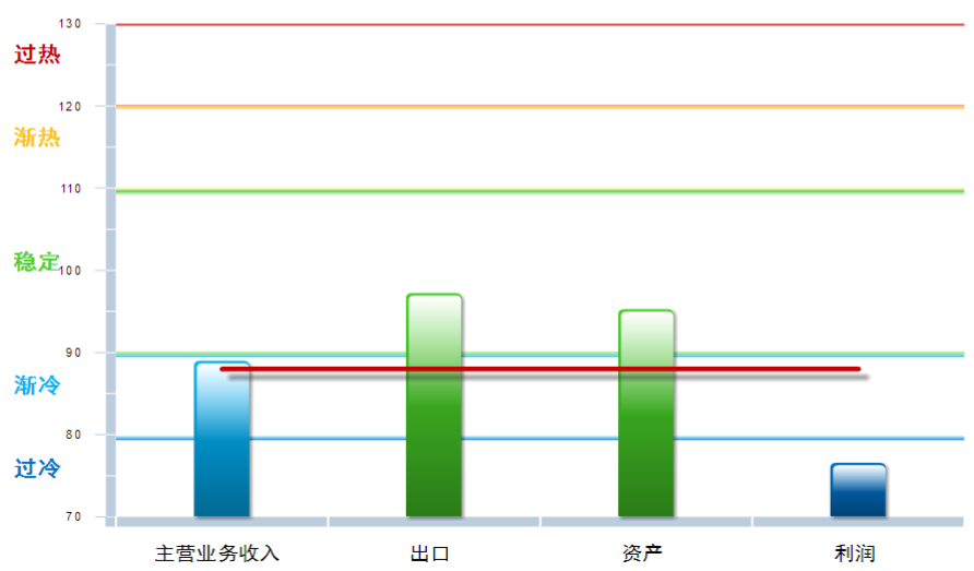 从分项指数看,出口景气度有较明显回升,其他三项分项指数均环比上月下降,其中:主营业务收入景气指数88.97,位于“渐冷”区间,较上月下降0.55点;出口景气指数为97.23,位于“稳定”区间,较上月上升8.41点;资产景气指数为95.26,位于“稳定”区间,较上月下降1.01点;利润景气指数76.57,位于“过冷”区间,较上月回升0.76点。