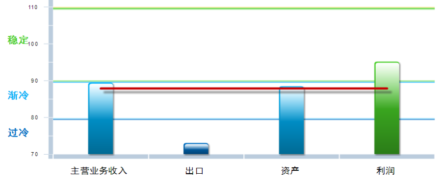 四项分项指数环比均下降,出口景气指出降幅明显,其中:主营业务收入景气指数89.50,位于“渐冷”区间,较上月下降0.86点;出口景气指数为73.08,位于“过冷”区间,较上月下降28.19点;资产景气指数为88.49,位于“渐冷”区间,较上月下降0.92点;利润景气指数95.17,位于“稳定”区间,较上月下降3.33点。
