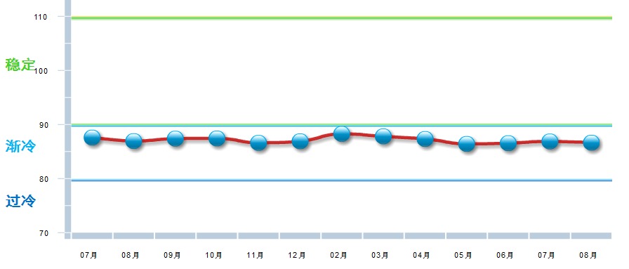 据中国轻工业经济运行及预测预警系统数据显示,2018年8月中国食品制造业景气指数为86.66,处在“渐冷”区间,较7月下降0.22点。