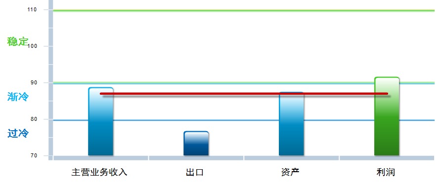除出口景气指数外,其他三项分类指数环比上月均有下降,其中:主营业务收入景气指数88.83,位于“渐冷”区间,较上月下降0.67点;出口景气指数为76.78,位于“过冷”区间,较上月上升3.7点;资产景气指数为87.54,位于“渐冷”区间,较上月下降0.95点;利润景气指数91.65,位于“稳定”区间,较上月下降3.52点。