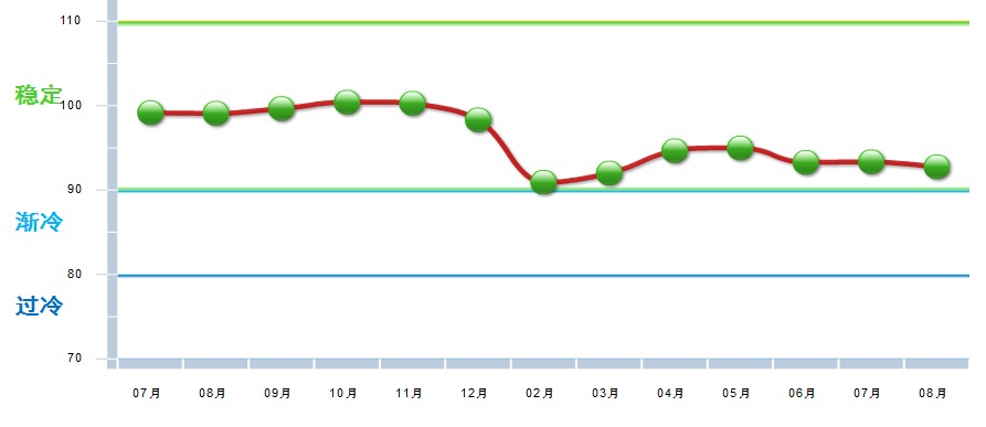除出口景气指数外,其他三项分类指数环比上月均有下降,其中:主营业务收入景气指数93.51,位于“稳定”区间,较上月下降0.5点;出口景气指数为96.99,位于“稳定”区间,较上月上升2.38点;资产景气指数为91.01,位于“稳定”区间,较上月下降0.31点;利润景气指数89.67,位于“渐冷”区间,较上月下降2.43点。