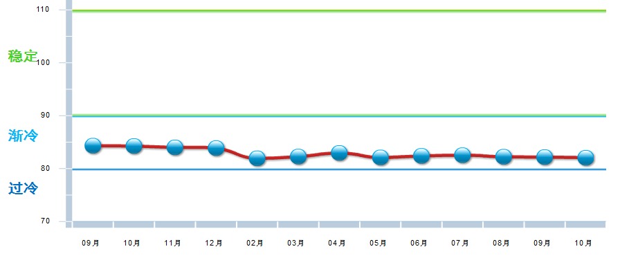 分项景气指数中,主营业务收入与上月基本持平,其他三项分项指数环比均有下降,其中:主营业务收入景气指数81.75,位于“渐冷”区间,较上月上升0.01点;出口景气指数为88.53,位于“渐冷”区间,较上月下降0.47点;资产景气指数为84.63,位于“渐冷”区间,较上月下降0.42点;利润景气指数77.64,位于“过冷”区间,较上月下降0.26点。