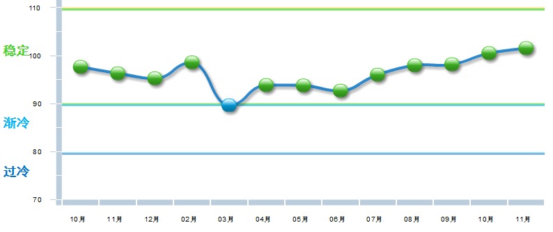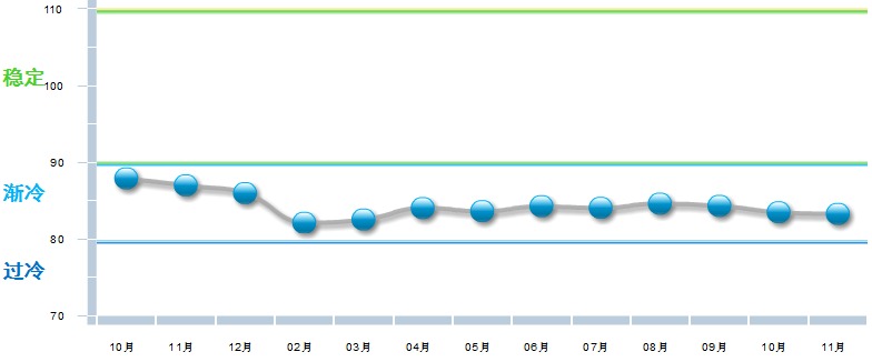 中国轻工业经济运行及预测预警系统数据显示:2018年,中轻景气指数延续去年四季度以来的下降态势,连续11个月在蓝色“趋冷”区间波动,11月中轻景气指数为87.98,环比10月下降0.03点,较去年同期下降1.64点。