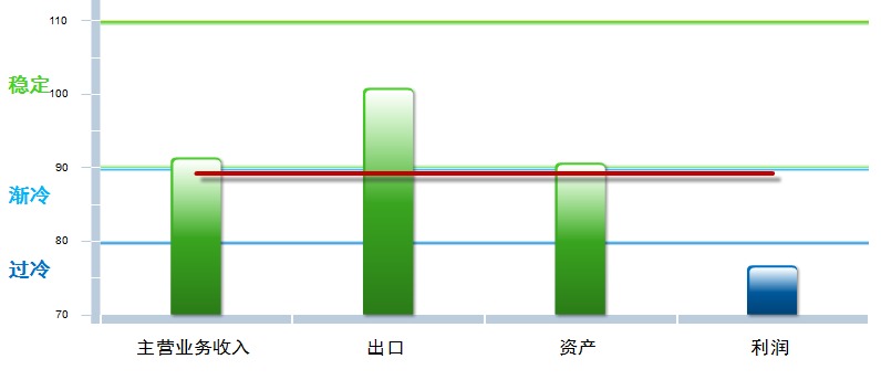 分项景气指数中,主营业务收入景气指数环比小幅回升,其他三项指数环比下降,出口景气指数上升幅度较大,其中:主营业务收入景气指数91.37,位于“稳定”区间,较上月回升0.09点;出口景气指数为100.86,位于“稳定”区间,较上月下降0.99点;资产景气指数为90.66,位于“稳定”区间,较上月下降0.25点;利润景气指数76.67,位于“过冷”区间,较上月下降2.69点。