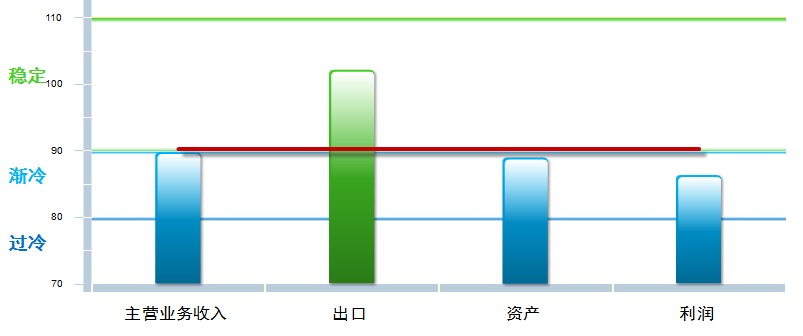 分项景气指数中,资产景气指数环比下降,其他三项分项景气指数回升,其中:主营业务收入景气指数89.80,位于“渐冷”区间,较上月回升0.37点;出口景气指数为102.15,位于“稳定”区间,较上月上升2.22点;资产景气指数为88.96,位于“渐冷”区间,较上月下降0.22点;利润景气指数86.33,位于“渐冷”区间,较上月上升0.46点。