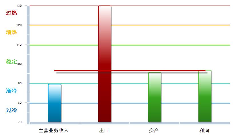 分项景气指数中,四项分享指数均环比上升,其中:主营业务收入景气指数89.67,位于“趋冷”区间,较上月上升0.76点;出口景气指数为138.03,位于“过热”区间,较上月上升58.51点;资产景气指数为95.71,位于“稳定”区间,较上月回升0.94点;利润景气指数96.85,位于“过冷”区间,较上月上升4.54点。