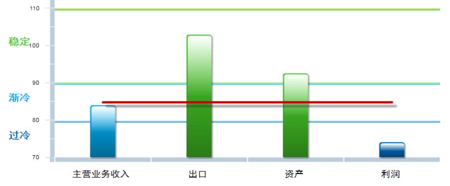 四项分项景气指数除出口指数外均较去年末下降,利润指数下降幅度较大,其中:营业收入景气指数83.99,位于“渐冷”区间,较去年末下降6.42点;出口景气指数为102.89,位于“稳定”区间,较去年末回升6.63点;资产景气指数为92.54,位于“稳定”区间,较去年末下降1.1点;利润景气指数74.10,位于“过冷”区间,较去年末下降26.39点。