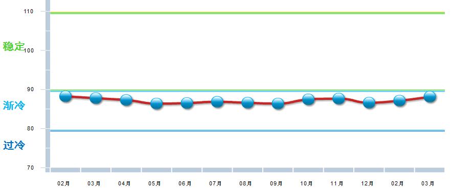 据中国轻工业经济运行及预测预警系统数据显示,2019年3月食品行业景气指数88.17,处在“渐冷”区间,较2月上升1.01点。
