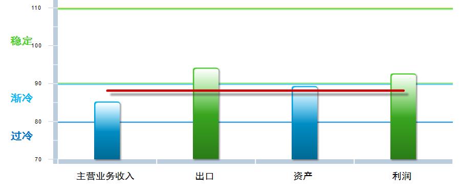 四项分项景气指数中利润、资产指数环比2月回升,营收、出口指数下降,其中:营业收入景气指数85.29,位于“渐冷”区间,较2月下降0.3点;出口景气指数为94.21,位于“稳定”区间,较2月下降0.85点;资产景气指数为89.37,位于“渐冷”区间,较2月回升0.18点;利润景气指数92.72,位于“稳定”区间,较2月回升5.96点。