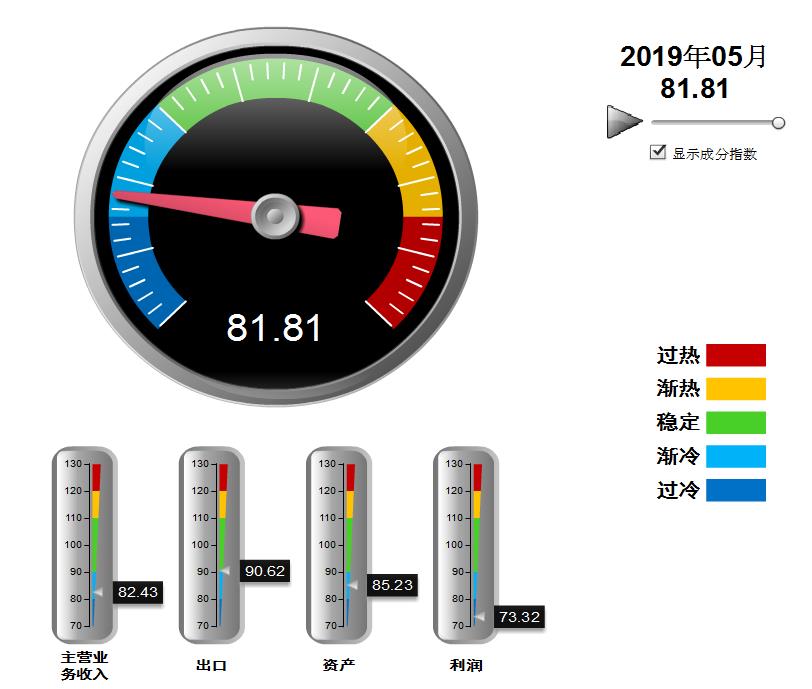 分项景气指数中,除资产景气指数外,其它三项分项指数环比4月均有回升。其中:营业收入景气指数82.43,位于“渐冷”区间,较4月回升0.43点;出口景气指数为90.62,位于“稳定”区间,较4月回升3.31点;资产景气指数为85.23,位于“渐冷”区间,较4月下降0.22点;利润景气指数73.32,位于“过冷”区间,较4月回升0.93点。