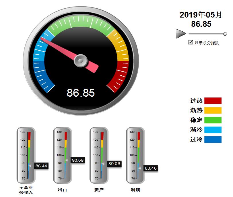 分项指数除资产景气指数外环比4月均有下降。其中:营业收入景气指数86.44,位于“渐冷”区间,较4月下降0.67点;出口景气指数为93.69,位于“稳定”区间,较4月下降5.03点;资产景气指数为89.06,位于“渐冷”区间,较4月回升0.06点;利润景气指数83.46,位于“渐冷”区间,较4月下降0.21点。