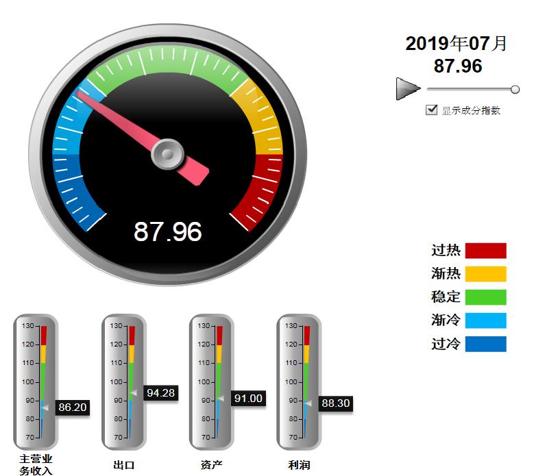 分项指数中,营收、利润景气指数环比小幅回升,出口、资产景气指数均有下降:营业收入景气指数86.20,位于“渐冷”区间,较6月回升0.41点;出口景气指数为94.28,位于“稳定”区间,较6月下降2.84点;资产景气指数为91.00,位于“稳定”区间,较6月下降0.16点;利润景气指数88.30,位于“稳定”区间,较6月回升0.43点。