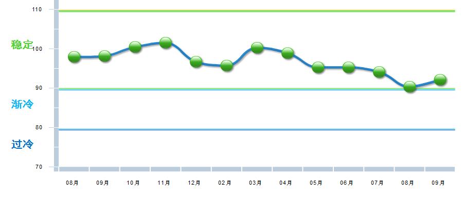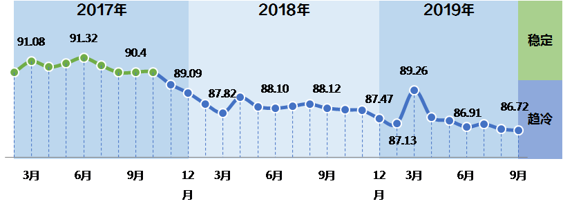 中国轻工业经济运行及预测预警系统数据显示:2019年,中轻景气指数继续在蓝色“趋冷”区间波动,前9个月呈震荡下行走势。9月中轻景气指数为86.72,较8月小幅下降0.08点,较去年同月下降1.4点。