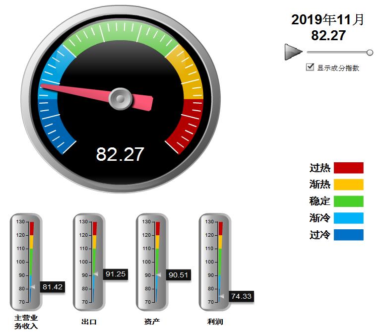 四项分项景气指数环比上月均有回升,利润景气指数回升幅度较大,其中:营业收入景气指数81.42,位于“渐冷”区间,较10月回升0.35点;出口景气指数为91.25,位于“稳定”区间,较10月回升2.98点;资产景气指数为90.51,位于“稳定”区间,较10月回升0.85点;利润景气指数74.33,位于“过冷”区间,较10月回升5.27点。