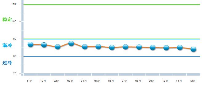 中国轻工业经济运行及预测预警系统数据显示:2019年,中轻景气指数继续在蓝色“趋冷”区间波动,全年呈震荡下行走势。12月中轻景气指数为85.76,较11月下降0.85点,较去年同月下降1.71点。
