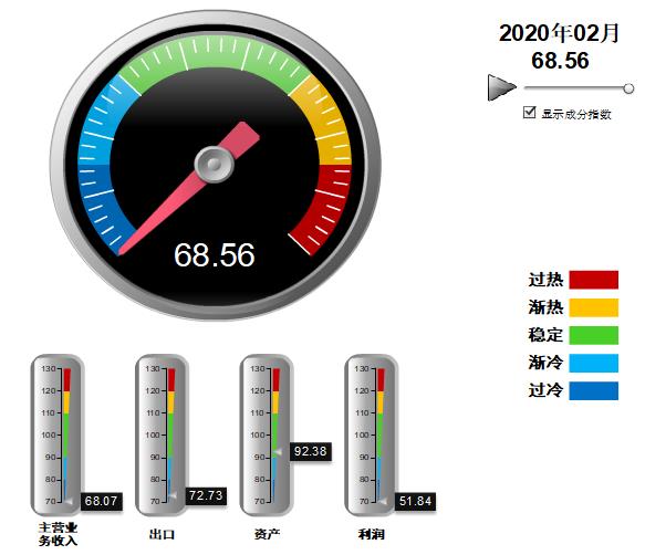 分项景气指数中,除资产景气指数外,其他分项指数均较上年末大幅下降,且均跌入“过冷”区间,利润景气指数跌幅最大,其中:营业收入景气指数68.07,位于“过冷”区间,较上年末下降15.36点;出口景气指数为72.73,位于“过冷”区间,较上年末下降18.51点;资产景气指数为92.38,位于“稳定”区间,较上年末回升3.26点;利润景气指数51.84,位于“过冷”区间,较上年末下降33.28点。