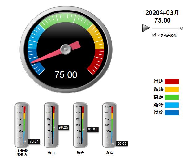 四项分项景气指数均较上月回升,出口景气指数回升幅度较大,其中:营业收入景气指数73.81,位于“过冷”区间,较上月回升5.74点;出口景气指数为96.25,位于“稳定”区间,较上月回升23.52点;资产景气指数为93.01,位于“渐冷”区间,较上月回升0.63点;利润景气指数56.66,位于“过冷”区间,较上月回升4.82点。