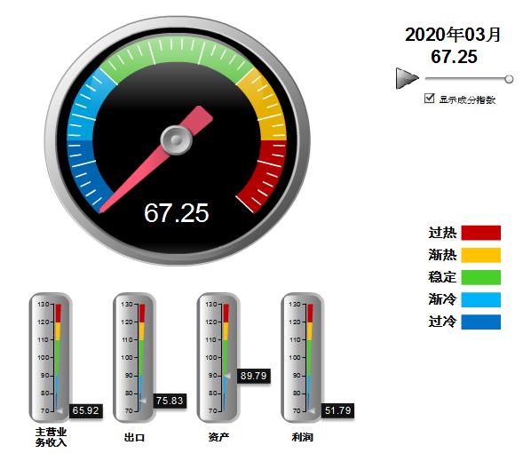 四项分项景气指数均较上月回升,营收、出口景气指数回升幅度较大,其中:营业收入景气指数65.92,位于“过冷”区间,较上月回升5.18点;出口景气指数为75.83,位于“过冷”区间,较上月回升7.99点;资产景气指数为89.79,位于“渐冷”区间,较上月回升0.14点;利润景气指数51.79,位于“过冷”区间,较上月回升0.98点。