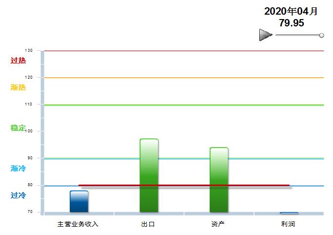 四项分项景气指数环比上月均有上升利润景气指数回升幅度较大,其中:营业收入景气指数78.04,位于“过冷”区间,环比上升4.23点;出口景气指数为97.33,位于“稳定”区间,环比上升1.08点;资产景气指数为94.12,位于“稳定”区间,环比上升1.11点;利润景气指数67.89,位于“过冷”区间,环比上升11.23点。