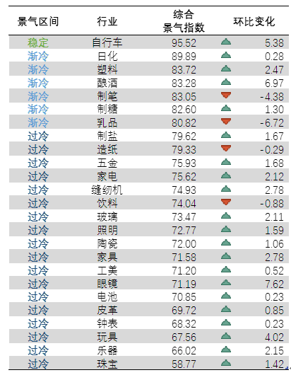 2020年6月, 对全国 25个重点行业进行监测,自行车行业景气度回升5.38点,位于“稳定”区间,日化、塑料、酿酒、制糖、制笔、乳品6个行业位于“渐冷”区间,制盐、造纸、五金、家电等18个行业位于“过冷”区间。与5月相比,25个重点行业中有21个行业综合景气度回升。整体行业景气情况如下: