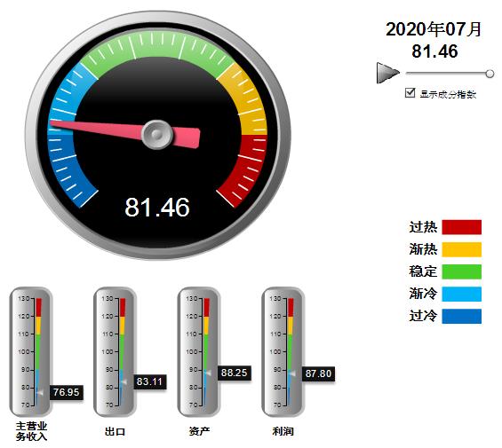 四项分项景气指数环比上月均有回升,利润、出口景气指数回升幅度较大。其中:营业收入景气指数76.95,位于“过冷”区间,环比上升1.41点;出口景气指数为83.11,位于“趋冷”区间,环比上升3.65点;资产景气指数为88.25,位于“趋冷”区间,环比上升0.57点;利润景气指数87.80,位于“趋冷”区间,环比上升4.55点。