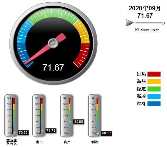 四项分项景气指数较上月均有上升,出口景气指数上升幅度较大。其中:营业收入景气指数70.92,位于“过冷”区间,环比回升0.51点;出口景气指数为74.75,位于“过冷”区间,环比上升4.61点;资产景气指数为89.55,位于“渐冷”区间,环比回升0.32点;利润景气指数60.17,位于“过冷”区间,环比回升1.27点。