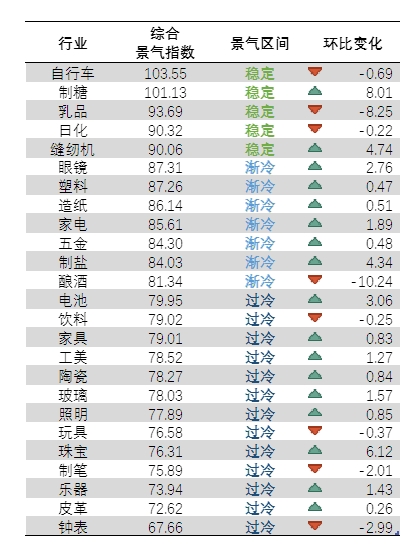 2020年11月, 对全国 25个重点行业进行监测,自行车、制糖、乳品、日化、缝制机械等5个行业景气度位于“稳定”区间,占20%。眼镜、塑料、造纸、家电、五金、制盐、酿酒等7个行业位于“渐冷”区间,占28%。钟表、皮革、乐器等13个行业位于“过冷”区间,占52%。与10月相比,25个重点行业中有17个行业综合景气度回升。整体行业景气情况如下: