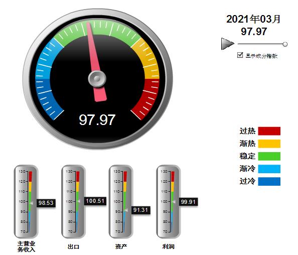 分项景气指数中,营收、出口、资产指数环比下降,利润指数环比上升。其中:营业收入景气指数98.53,位于“稳定”区间,环比下降3.08点;出口景气指数为100.51,位于“稳定”区间,环比下降4.05点;资产景气指数为91.31,位于“稳定”区间,环比下降0.87点;利润景气指数99.91,位于“稳定”区间,环比上升2.22点。