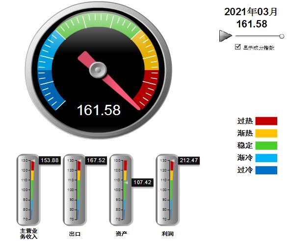 分项景气指数中,资产景气环比小幅回升,其他指数高位回落。其中:营业收入景气指数153.88,位于“过热”区间,环比下降13.39点;出口景气指数为167.52,位于“过热”区间,环比下降3.23点;资产景气指数为107.42,位于“稳定”区间,环比上升1.47点;利润景气指数212.47,位于“过热”区间,环比下降247点。