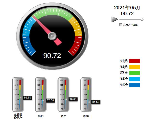 四项分项景气指数中,营收、利润景气指数环比下降,出口、资产指数小幅回升。其中:营业收入景气指数93.50,位于“稳定”区间,环比下降1.08点;出口景气指数为87.30,位于“趋冷”区间,环比上升0.37点;资产景气指数为90.01,位于“稳定”区间,环比上升0.52点;利润景气指数84.56,位于“趋冷”区间,环比下降4.28点。