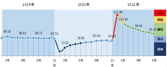 中国轻工业经济运行及预测预警系统数据显示:2021年1-9月轻工业生产、出口较快增长,消费品零售、行业投资稳步恢复。因去年2季度开始行业生产加快恢复,基数逐步回升影响,前9个月轻工景气指数呈高位回落态势。9月中轻景气指数为93.25,处在“稳定”区间,环比上月回落1.97点。