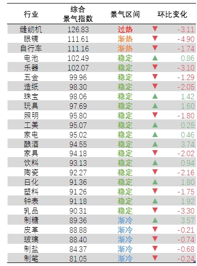 25个重点行业进行监测,缝纫机械行业景气度位于“过热”区间;自行车、眼镜行业位于“渐热”区间,占8%。电池、乐器、五金等17个行业位于“稳定”区间,占68%。制笔、制盐、玻璃等5个位于“渐冷”区间,占20%。电池、珠宝、玩具、工美等10个行业景气指数环比上升,占比40%,其他行业下降。整体行业景气情况如下: