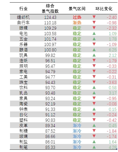 25个重点行业进行监测,缝纫机械行业景气度位于“过热”区间;自行车行业位于“渐热”区间;电池、乐器、五金等18个行业位于“稳定”区间,占72%。制笔、制盐、玻璃等5个位于“渐冷”区间,占20%。酿酒、制笔、乳品、玩具等10个行业景气指数环比上升,占比40%,其他行业下降。整体行业景气情况如下: