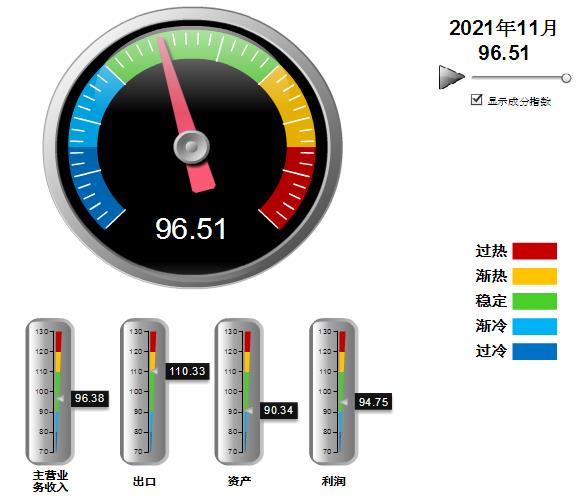 分项景气指数中,营收、利润指数环比上月下降,出口、资产指数回升,其中:营业收入景气指数96.38,位于“稳定”区间,环比下降1.18点;出口景气指数为110.33,位于“渐热”区间,环比上升2.82点;资产景气指数为90.34,位于“稳定”区间,环比上升0.47点;利润景气指数94.75,位于“稳定”区间,环比下降7.1点。