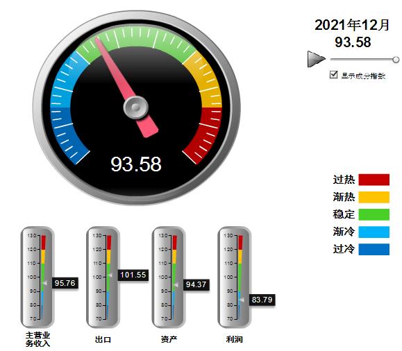 四项分项景气指数环比均有下降,出口指数降幅较大,其中:营业收入景气指数95.76,位于“稳定”区间,环比下降1.2点;出口景气指数为101.55,位于“稳定”区间,环比下降5.88点;资产景气指数为94.37,位于“稳定”区间,环比下降0.08点;利润景气指数83.79,位于“渐冷”区间,环比下降3.22点。