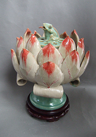 15、2013年,“绿釉双耳汤壶”获四川省大师精品展金奖;“莲花净水瓶”获中国西部陶艺双年展二等奖;“莲花香薰”获“太阳神鸟杯”天府?宝岛工业设计大赛工艺美术品?旅游纪念品专项赛银奖。