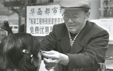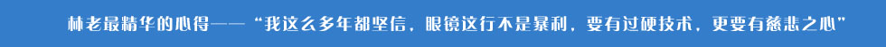 在林老手中,有上百位高度近视患者,面临失明痛苦的患者重新沐浴了光明的洗礼。他对付高度近视,有一整套秘籍,最核心的就是,精确的配镜度数。“有时候度数配高了,看远的清楚,看近的又模糊。有时度数配低一点,反而能让几乎报废的眼睛重见光明。”林老摸索出,一般戴上眼镜后,能达到1.0的视力,这时的度数是最合适的。