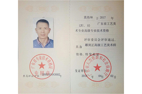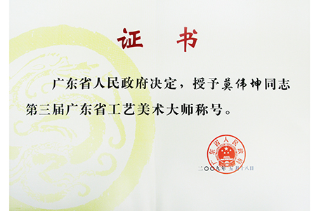 正高级工艺美术师 广东省工艺美术大师 中国文房四宝制砚艺术大师 宝砚堂端砚文化艺术馆馆长 莫伟坤,广东肇庆人,宝砚堂端砚文化艺术馆馆长,毕业于中国书画函授大学,结业于北京清华大学高级艺术研修班。于1987年起从事端砚行业工作,在其刻苦努力下,获得了一定的成绩,现为中国文房四宝制砚艺术大师、广东省工艺美术大师、正高级工艺美术师、一级技师,中国砚都十大制砚名师、最受中国收藏家喜爱的砚雕艺术大师、中国端砚鉴定专家、广东金融学院客座教授、广东省工艺美术协会常务理事、肇庆端砚协会副会长、肇庆市工艺美术协会副会长,肇庆市高要区端砚协会副会长。