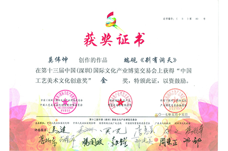 三是提高砚雕创作的艺术性,致力形神契合,推陈出新意,天工巧雕饰的作品有《开天辟地》、《飞天之舞》、《樱花时节》、《春天的浪漫》、《执手》、《衣钵传承》、《出浴》、《纪念》、《海誓山盟》、《悟》等。此类作品将石的意境与古今情怀图文并茂于砚品,突显端砚作品的艺术美感,令观者赏心悦目。