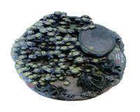 二是增加砚雕创作的观赏性,做到刀法传神。突破传统技法,因材施艺的作品有《气壮山河》、《赤壁怀古》、《月下追韩信》、《一指定江山》、《嫦娥奔月》、《群仙会》、《观沧海》、《从前》、《一帆风顺》、《和谐》等。此类作品充分利用石品特质,章显气势恢宏的历史人文景观令人心旷神怡。