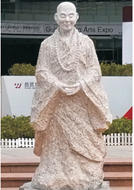 潘斌强经过三年多对《六祖坛经》的潜心研究,并多次与友人探讨互动,脑海中逐渐形成了惠能的影像:一个德高望重,有着大智慧的老者,历尽风雨,了了分明,如如不动,缓缓走在人们生活当中,语重心长,宏扬佛法,渡人自渡。于是,创作的冲动如大海澎湃,一次又一次撞击心房;选石、勾图、打凿,一个个细节在脑海中演习了无数次;每当夜深人静时,就思考如何运用雕塑语言去表达一个朴实无华的造像,兼工带写、粗中有细;具象与印象的结合、写实与写意的融合;眼睛是心灵的窗口,要刻画细腻,汇聚着睿智、慈祥与亲和;嘴巴念动,传播着佛音,言简意深,娓娓动听;再从“本来无一物,何处惹尘埃?”中得到感悟,表现其身躯用写意、印象的手法,恰到好处地刻画出结构造型……经过反复构思,心目中六祖的形象日趋成熟,蓄志待发。