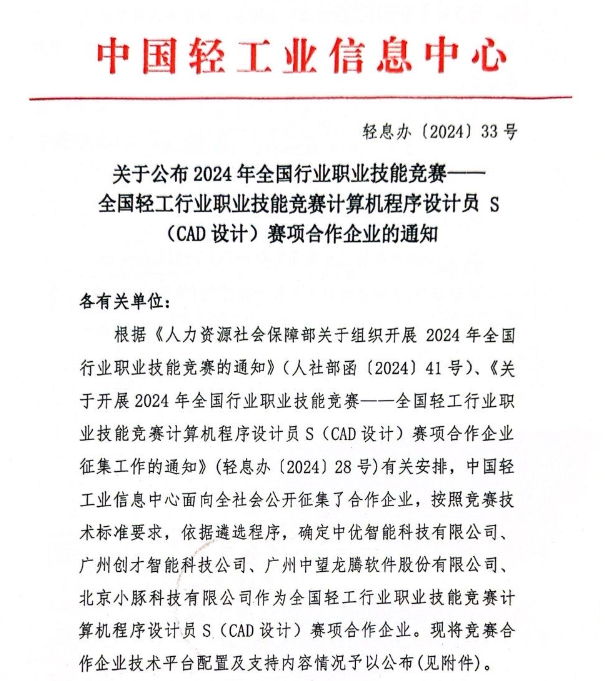 近日, 经过严格的征集和筛选流程,正式公布了2024年全国行业职业技能竞赛——全国 职业技能竞赛计算机程序设计员(CAD设计)赛项的合作企业名单。其中,入围企业包括中优智能科技有限公司、广东创才智能科技有限公司、广州中望龙腾软件股份有限公司和北京小豚科技有限公司。