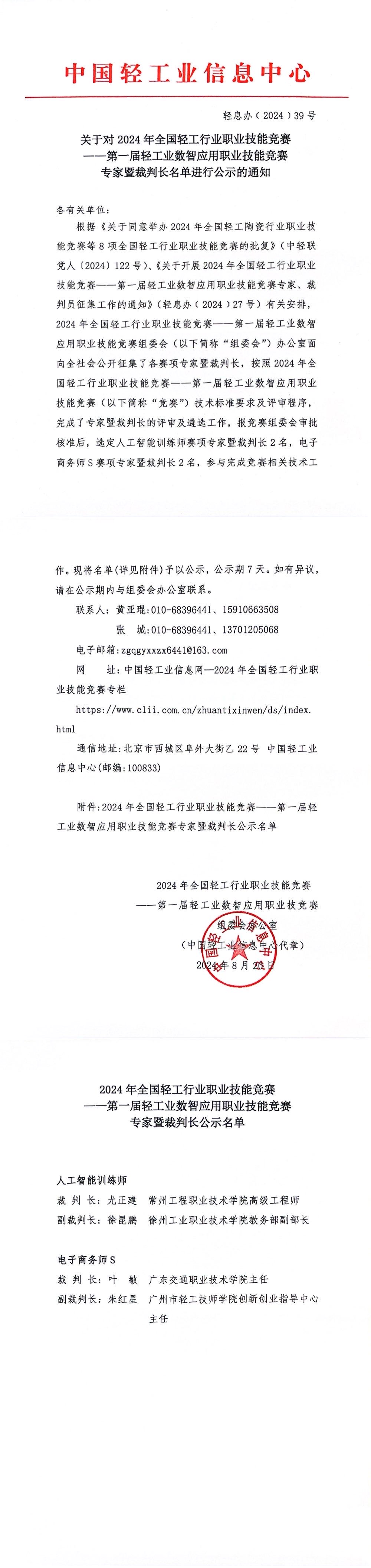 关于2024年全国 职业技能竞赛——第一届轻工业数智应用职业技能竞赛专家暨裁判长名单进行公示的通知