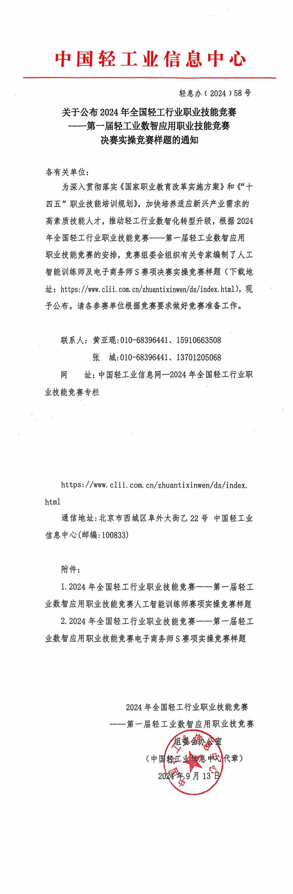 关于公布2024年全国 职业技能竞赛——第一届轻工业数智应用职业技能竞赛实操竞赛样题的通知