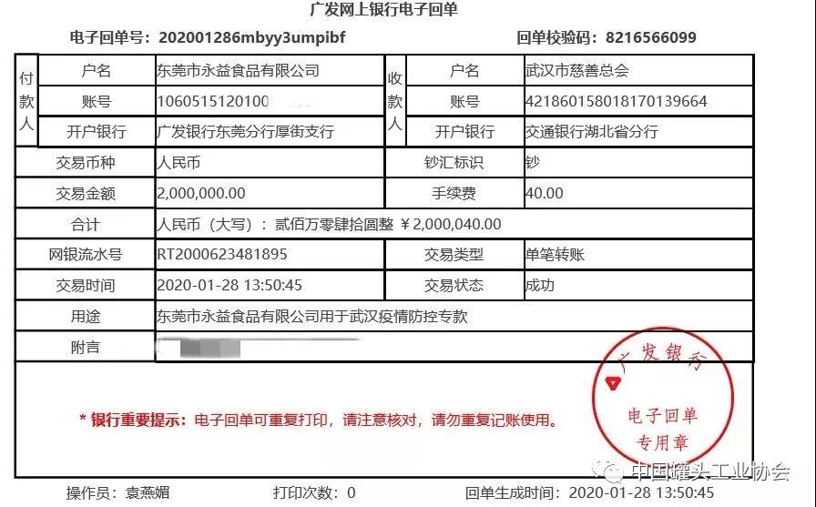 自疫情发生以来,永益食品董事长王庆和先生与董事会及公司高层高度重视、时刻关注,不仅在第一时间迅速反应,紧急采取多项措施尽力保障员工与家人健康安全,切实做好企业自身疫情防控的同时,积极履行社会责任与发扬民族品牌精神,迅速调集资金,向武汉市慈善总会捐赠200万元,用于武汉疫情防控医疗专用款项。