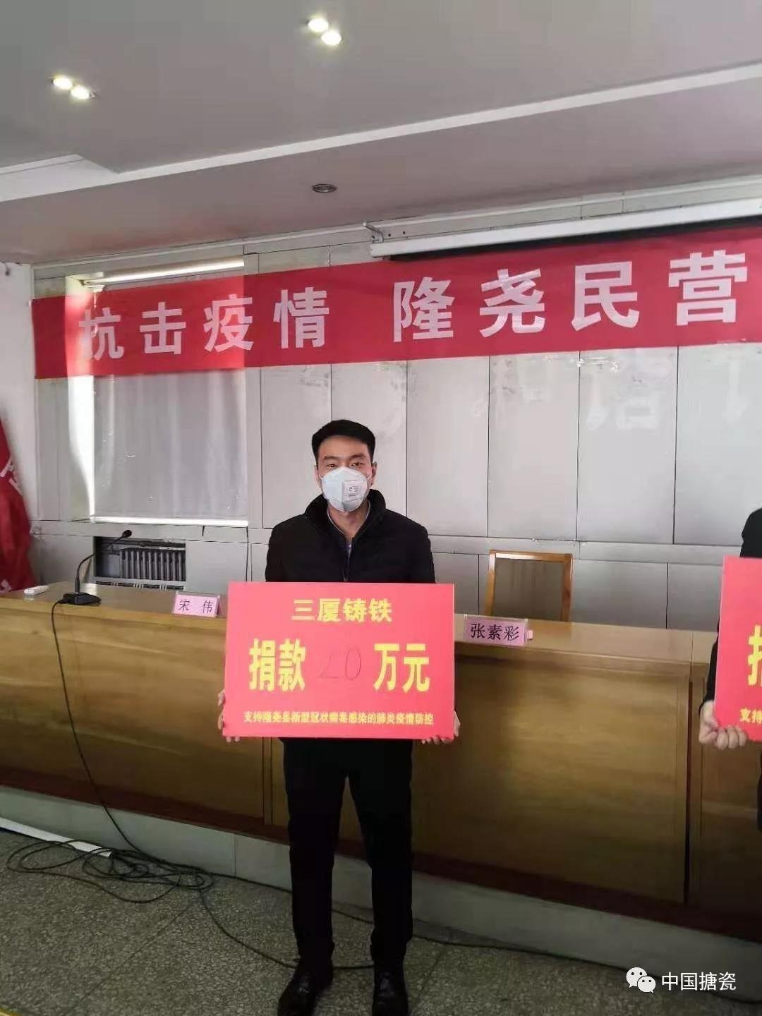 1月30日上午10时,在隆尧县民营企业抗击疫情募捐仪式上,中国搪瓷工业协会副理事长单位三厦铸铁有限公司捐款20万元,彰显非常时期民营企业担当精神!